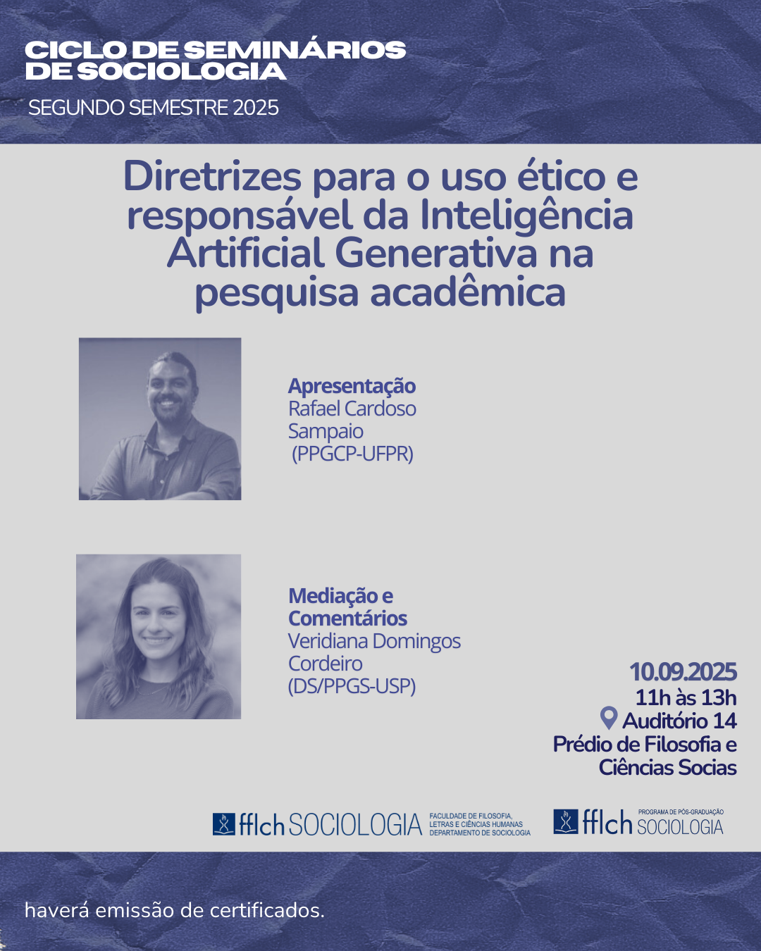 Sociedade & Cultura Diretrizes para o uso ético e responsável da Inteligência Artificial Generativa na pesquisa acadêmica Sala 14, Prédio da Filosofia e Ciências Sociais da FFLCH USP 10 de Setembro de 2025, quarta-feira 11h às 13h00 Palestrante: Rafael Cardoso Sampaio (PPGCP-UFPR) Debatedora: Veridiana Domingos Cordeiro (DS/PPGS-USP)